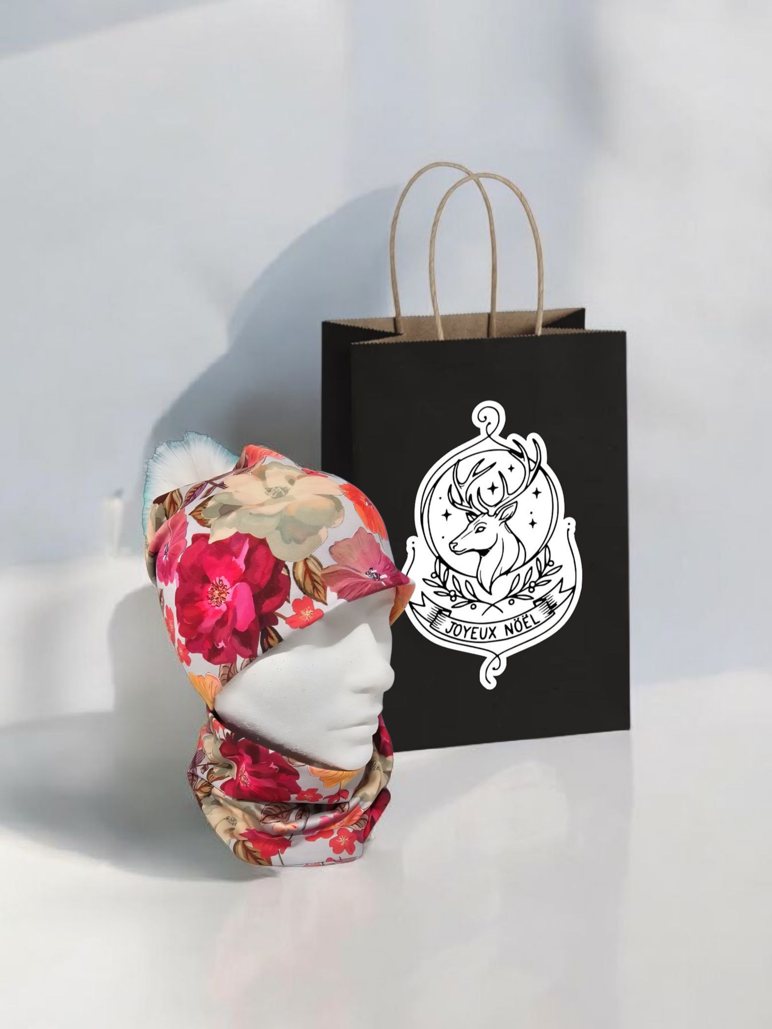 L'ensemble tuque à pompon détachable et cache-cou est doublé en coton (mélange de coton et de lycra).